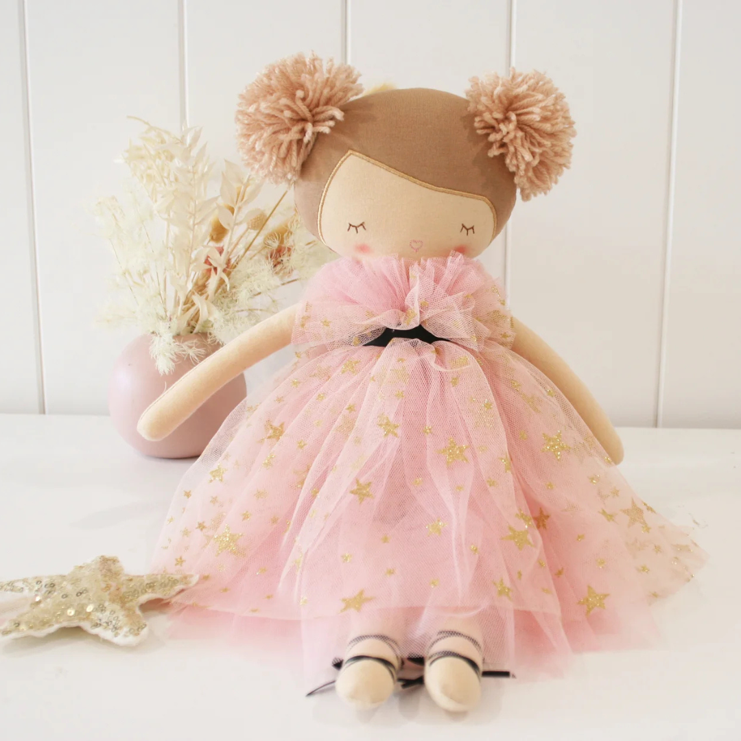 Elevate your child's playtime with the enchanting Alimrose Halle Ballerina Doll! Lovingly handcrafted by talented female artisans from The Philippines, this doll embodies craftsmanship and care in every stitch. Featuring a soft tulle layered ballet-style dress adorned with sparkly gold stars, delicate embroidered face details, and whimsical pom-pom yarn hair, the Halle Ballerina Doll is designed to ignite your child's imagination and bring joy to their play. With a diverse range of five combinations to choose from, there's a Halle Ballerina Doll for every child. Discover the magic of imaginative play with this exquisite doll today.