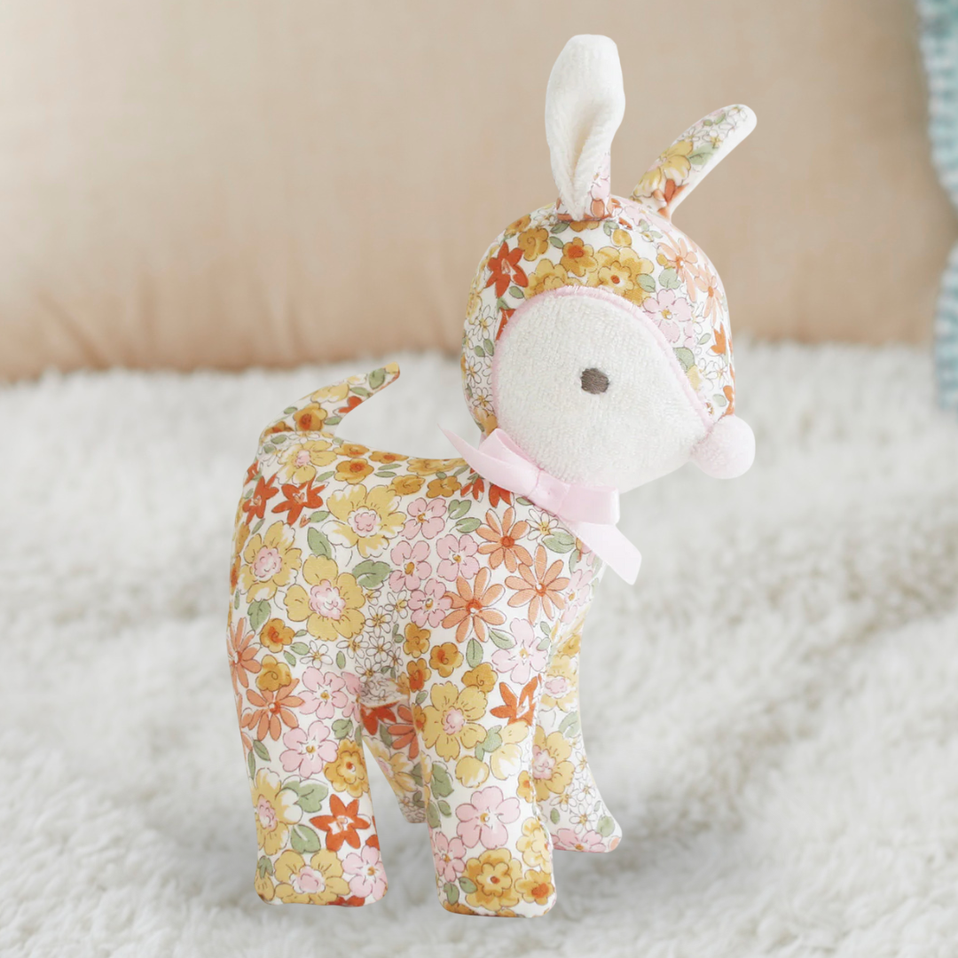 Our darling Baby Deer Rattle is the perfect first toy for your little love. Standing at a cuddly 16cm, this beautifully crafted rattle is soft, lightweight, and just the right size for tiny hands to hold. Featuring delicate floral prints, soft ears and a gentle rattle sound, it’s designed to delight and soothe babies from their earliest days.