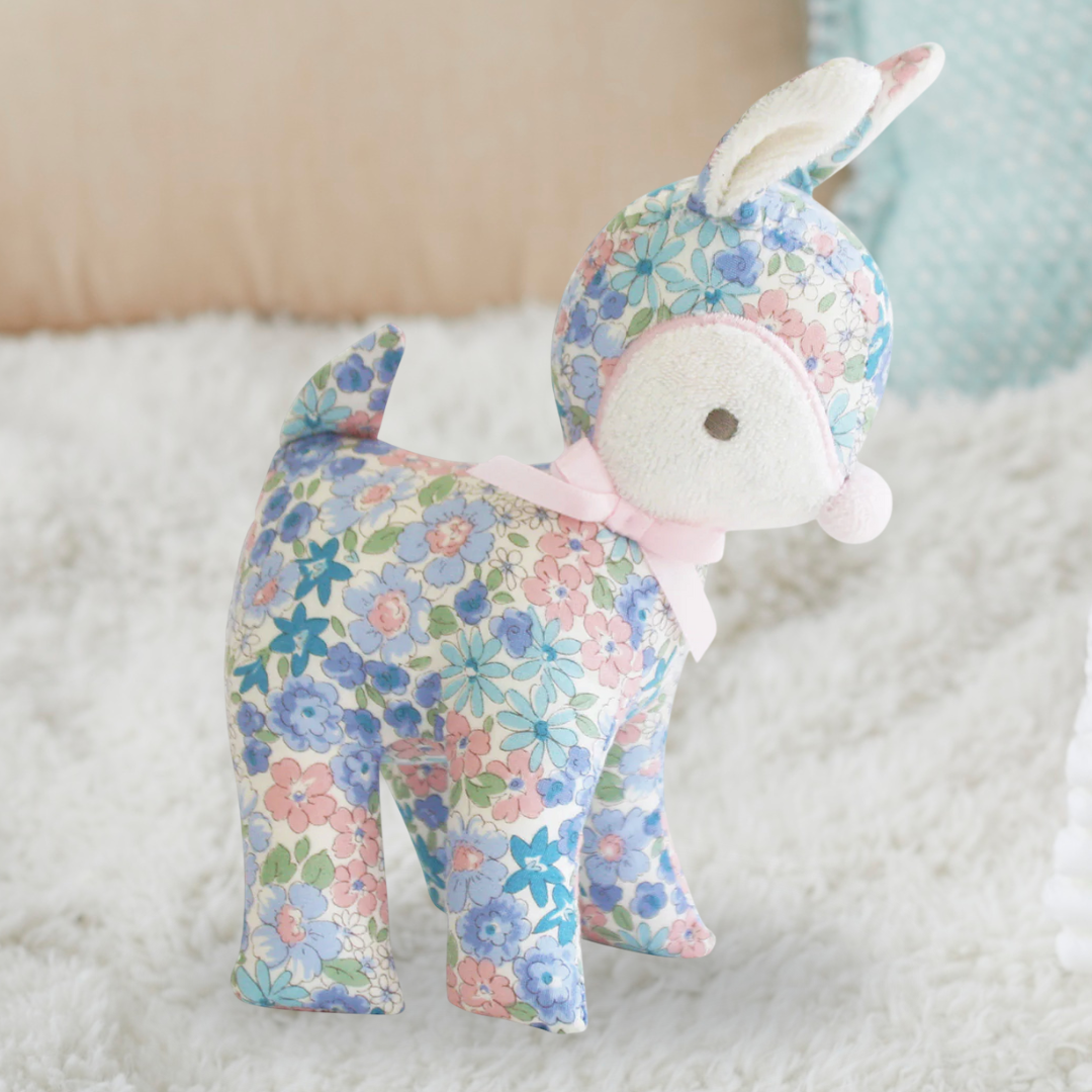 Our darling Baby Deer Rattle is the perfect first toy for your little love. Standing at a cuddly 16cm, this beautifully crafted rattle is soft, lightweight, and just the right size for tiny hands to hold. Featuring delicate floral prints, soft ears and a gentle rattle sound, it’s designed to delight and soothe babies from their earliest days.