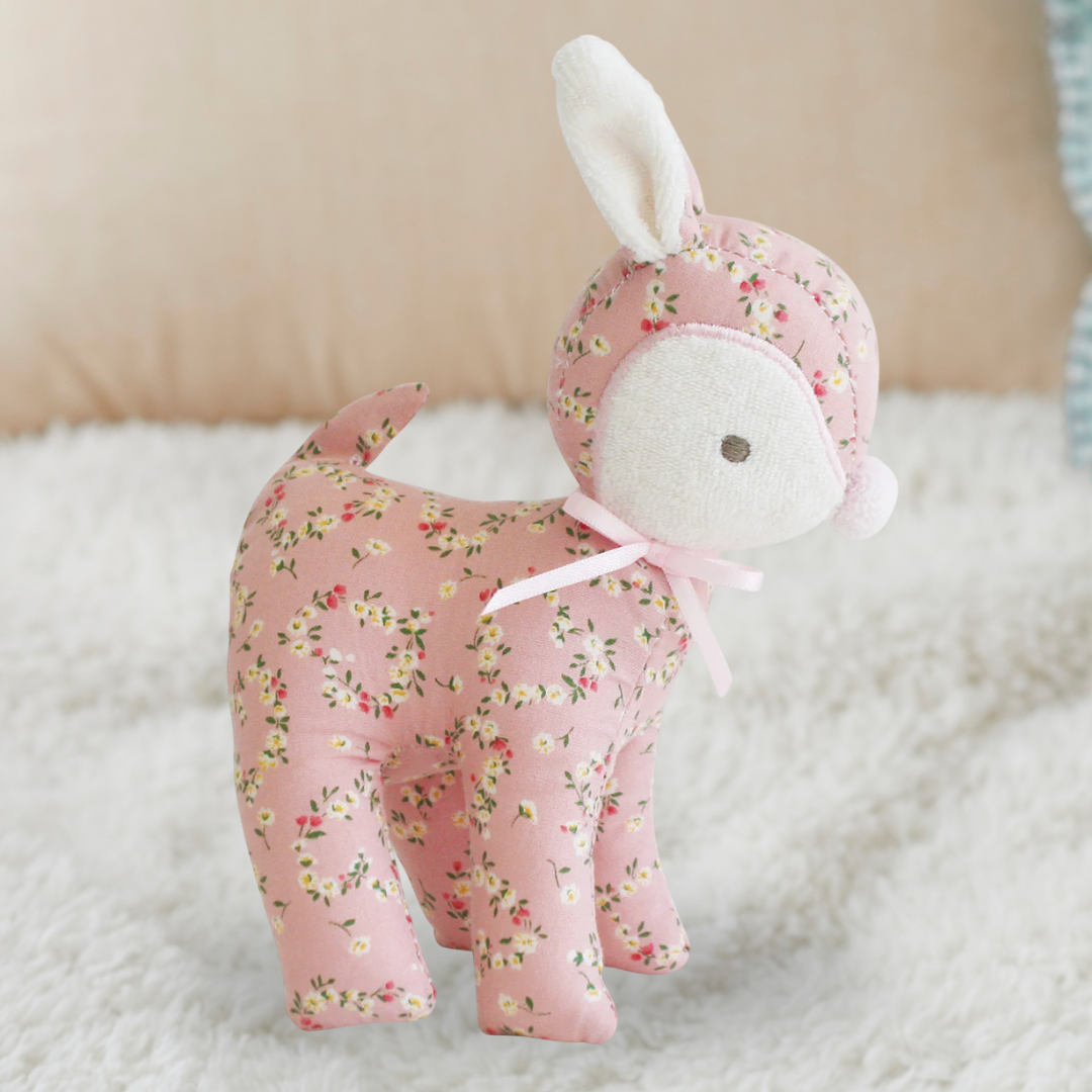 Our darling Baby Deer Rattle is the perfect first toy for your little love. Standing at a cuddly 16cm, this beautifully crafted rattle is soft, lightweight, and just the right size for tiny hands to hold. Featuring delicate floral prints, soft ears and a gentle rattle sound, it’s designed to delight and soothe babies from their earliest days.