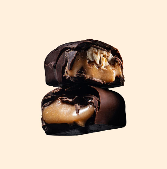 Butter Caramel Pecan | The best refined sugar free and vegan butterscotch caramel you have ever tasted; enrobed in 70% rich bittersweet dark chocolate. Sprinkled with our in house made cinnamon and maple roasted Eltham pecans.