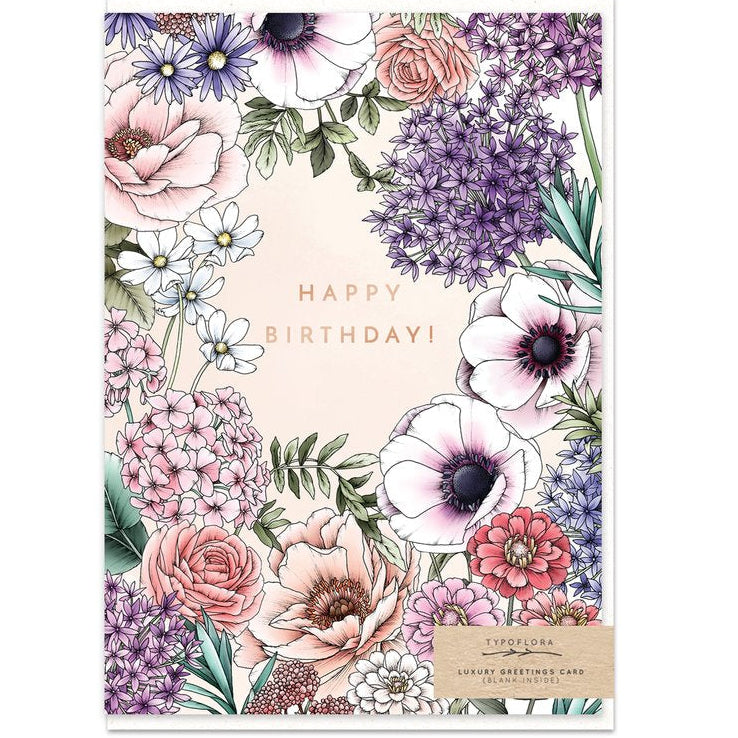- hand drawn floral and foliage illustrations and calligraphy with rose gold foil finish