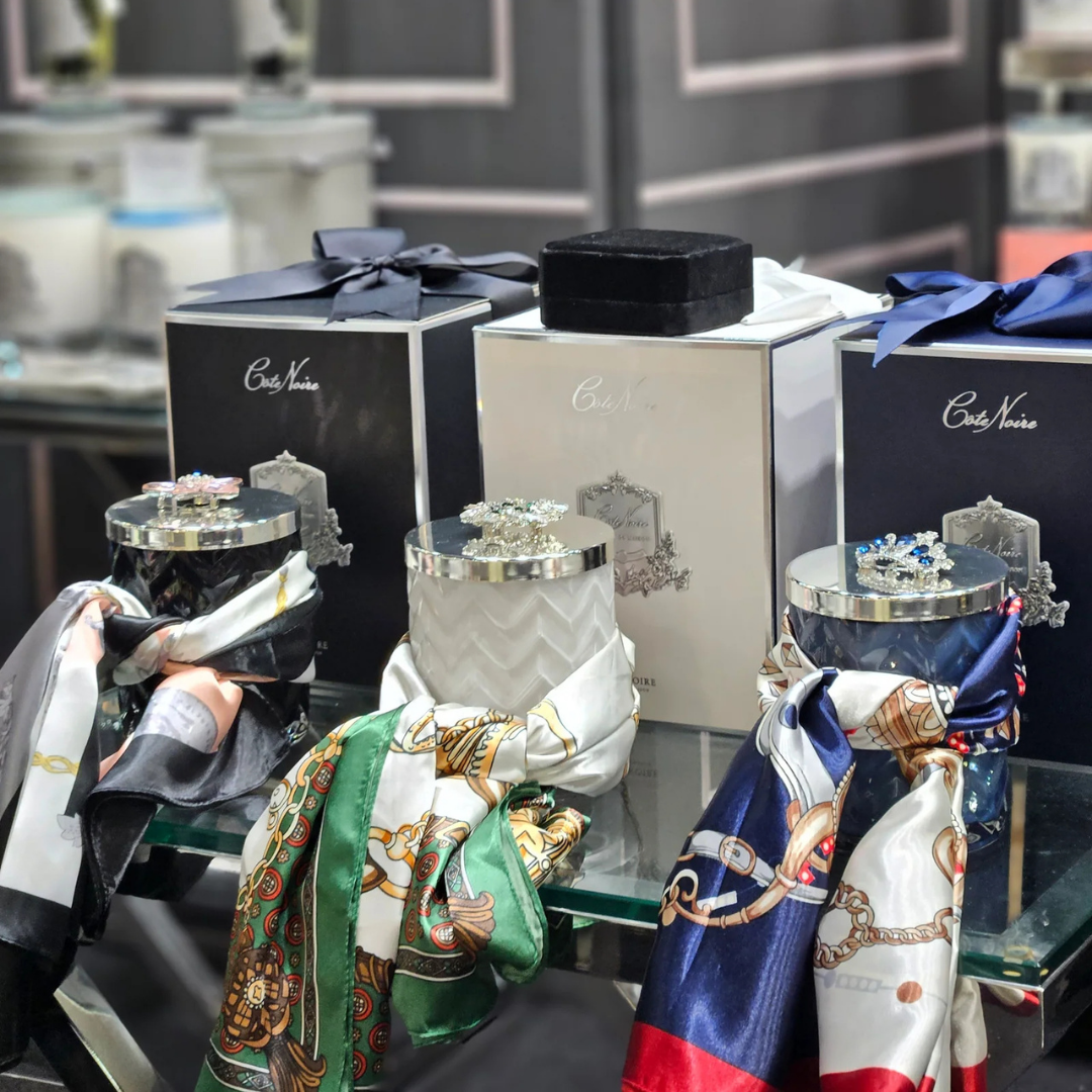 Limited-edition Herringbone candles come in a decorative herringbone glass, adorned with an elegant Côte Noire gift box with Silk feel scarf and magnetic decorative brooch.