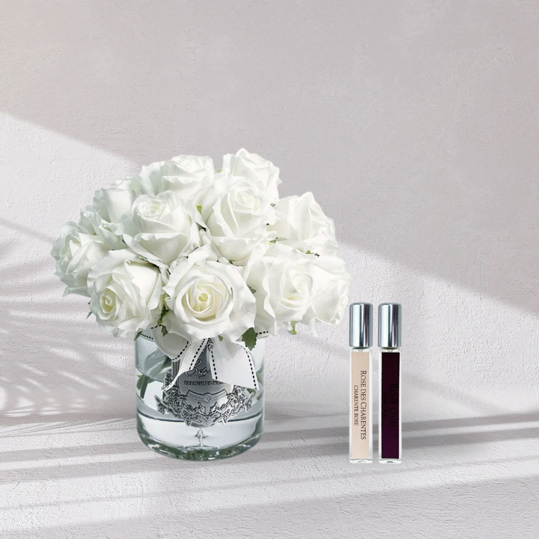 Cote Noire Luxury Grand Rose Bud Bouquet - White - Silver Badge