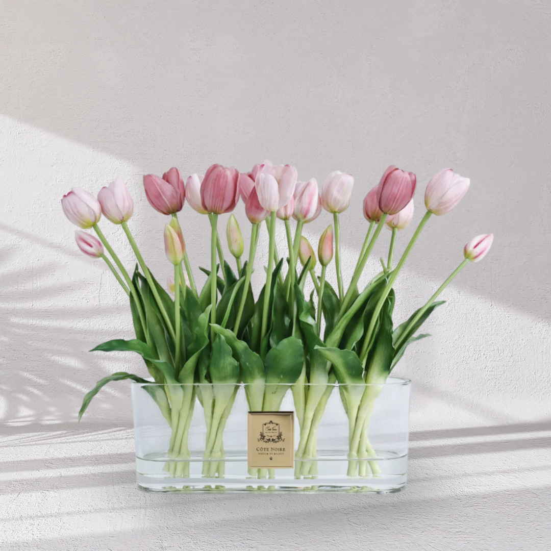 Each life-like perfumed Oval Tulip Bouquet has been skilfully hand crafted. Each petal has a special natural coating to give the arrangement a true to life touch & appearance. Arranged in a luxury oval glass vase, finished off with one of Cote Noire's gold signature badges.