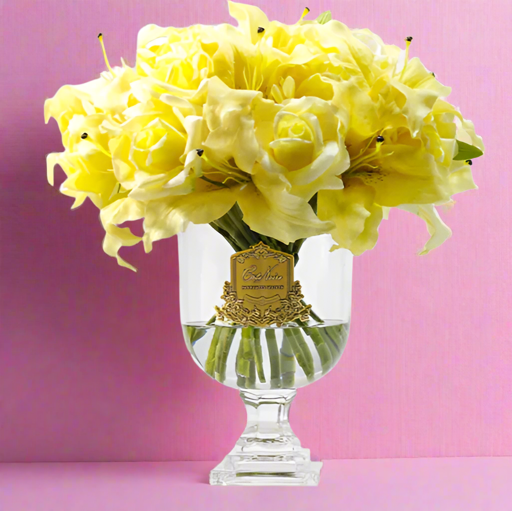 Each life-like perfumed Versailles Lilies & Roses Bouquet has been skilfully hand crafted and set in gel giving it the appearance of water. Each petal has a special natural coating to give them a true to life touch & appearance. Each bouquet has been arranged in a luxury vase with a Cote Noire signature badge.