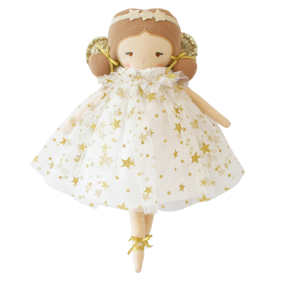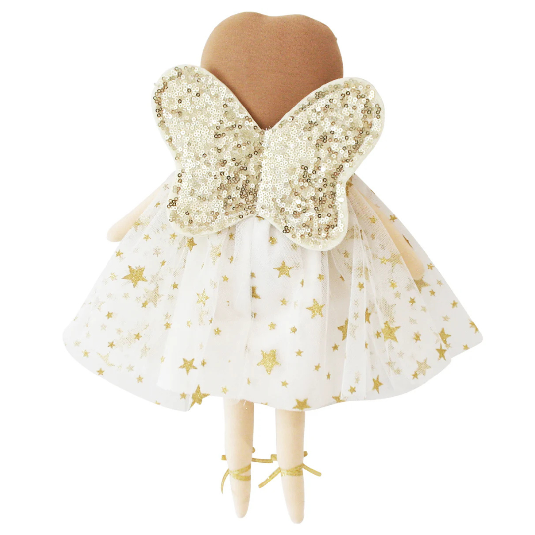 So beautiful! Holly Fairy Doll is a delight in her ivory and gold star tulle dress, gold star headband and gold sequin wings.
