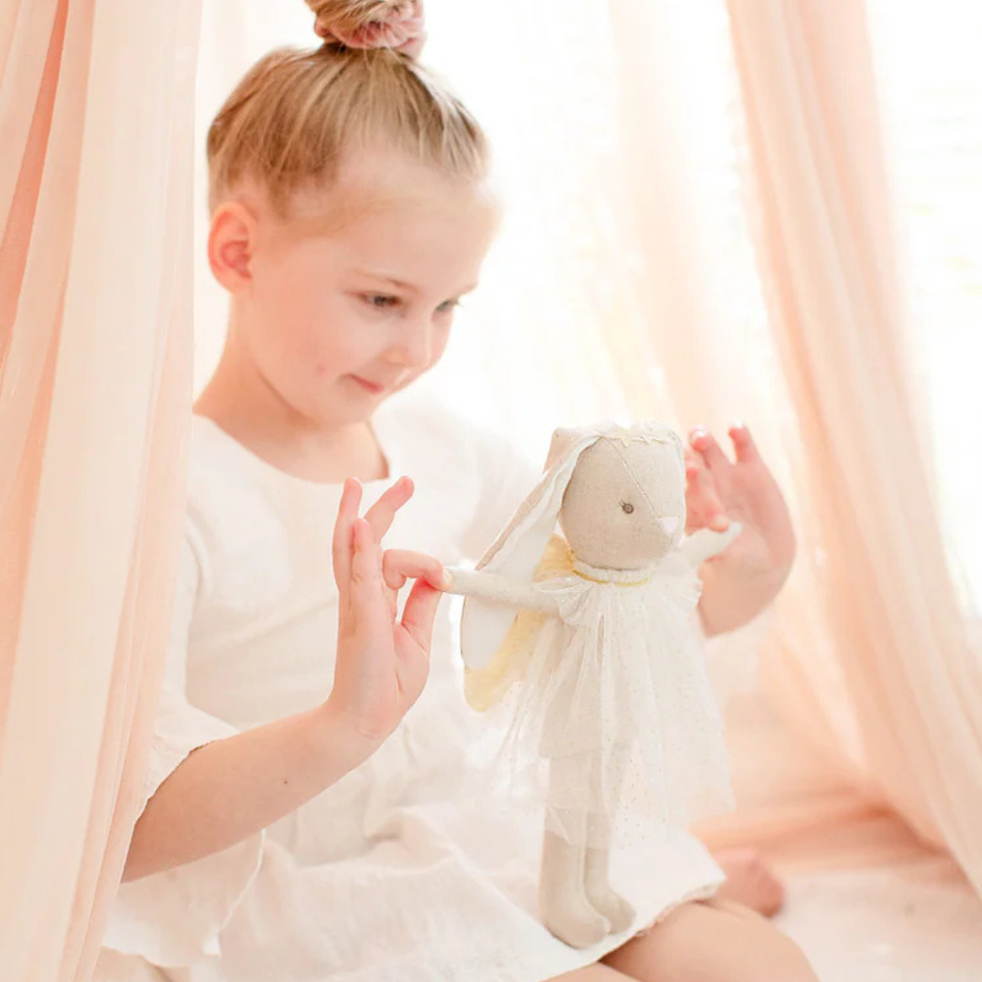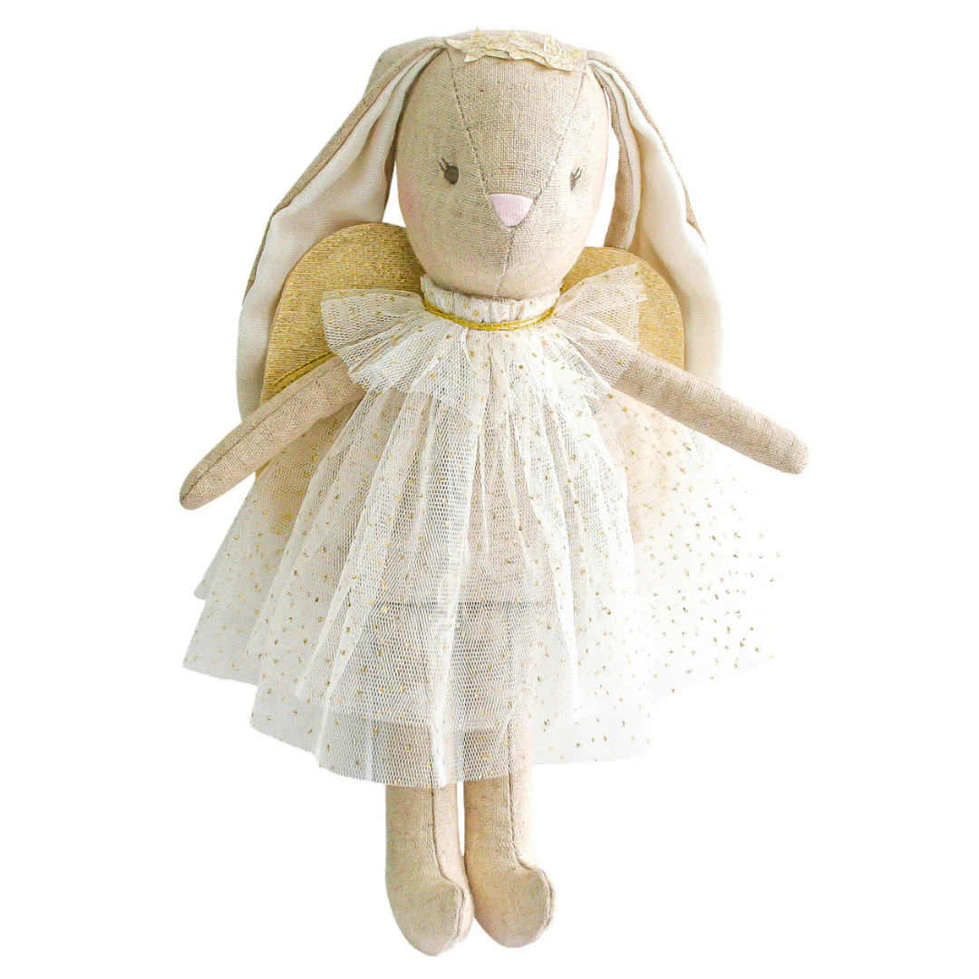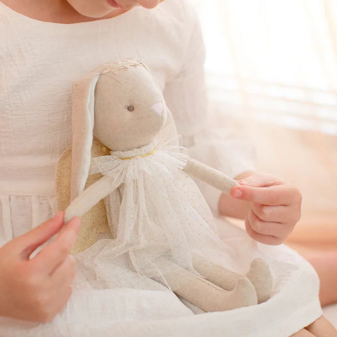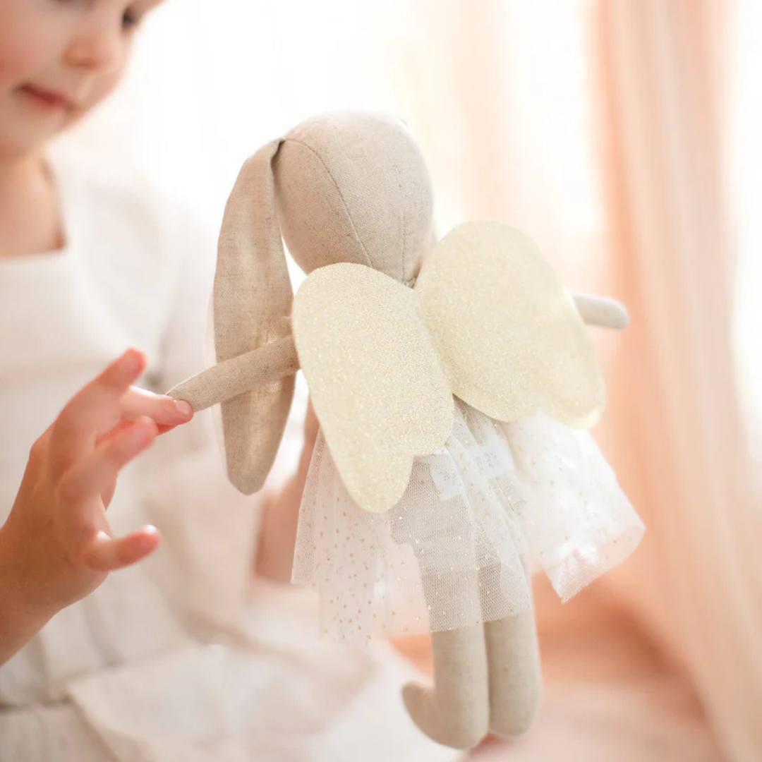 Mini Angel Bunny is a beautiful linen bunny dressed in the ivory gold sparkle tulle with gold sparkly wings. She will become your treasured keepsake. Suitable from 3 years.